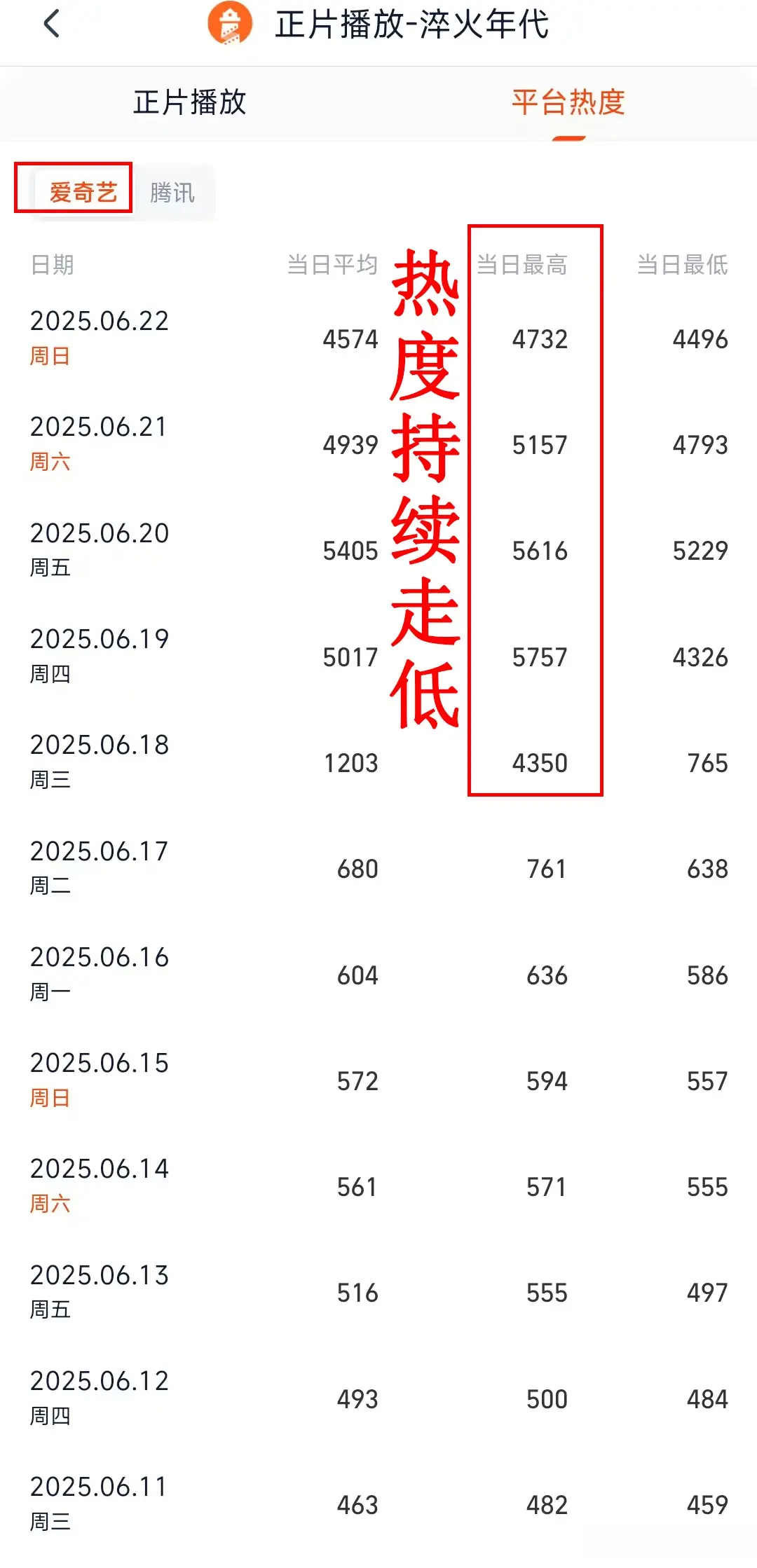 爱奇艺平台站内热度从 19 日最高 5757,6 月 22 日掉到 4732;