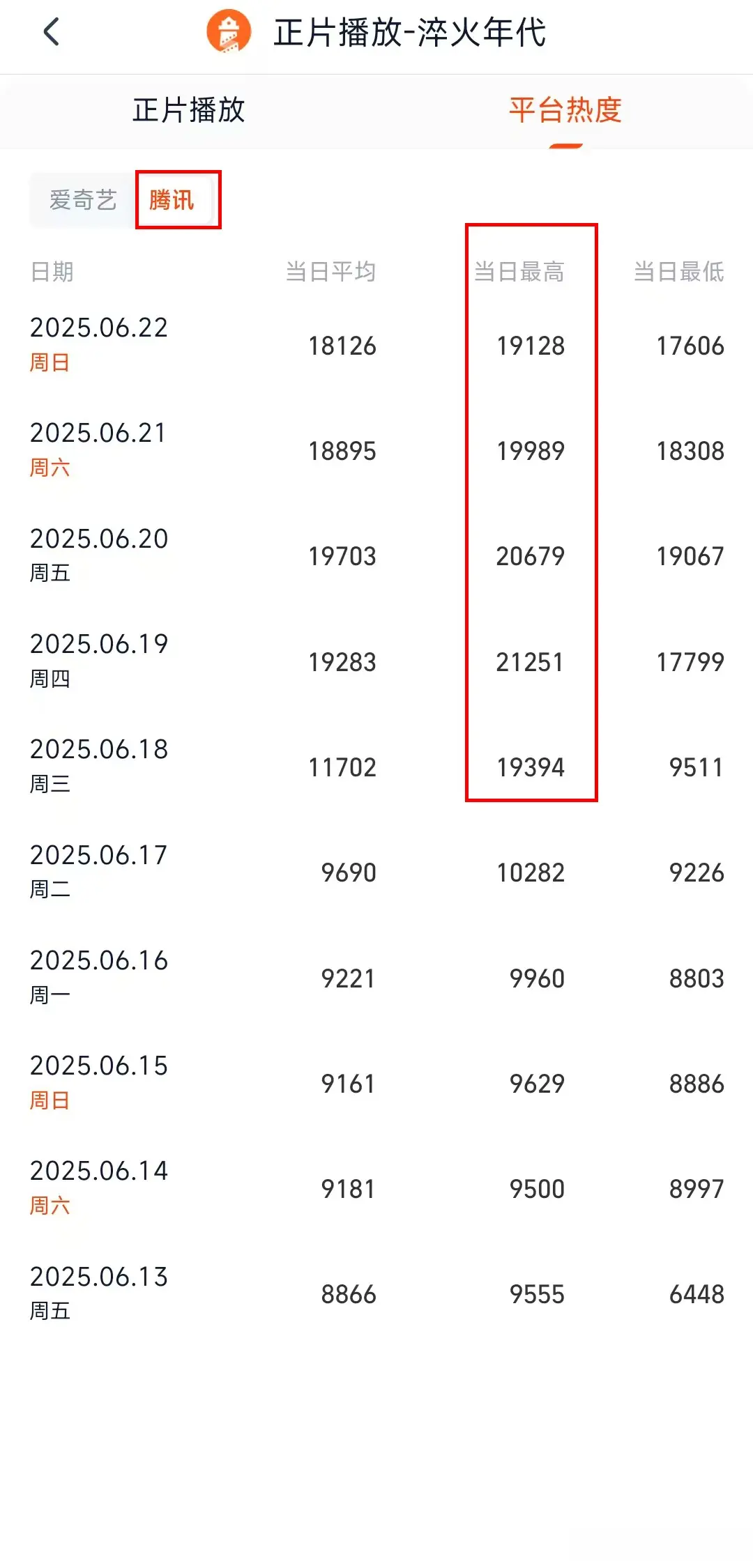腾讯平台站内热度从 19 日最高 21251,6 月 22 日掉到了 19128。